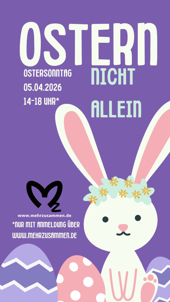 Wir feiern am Ostersonntag, 05. April 2026 zum dritten Mal „Ostern nicht allein“ – für die kleineren Kinder gibt es eine Ostereiersuche, für die größeren Kinder eine Rallye. Natürlich gibt es auch wieder unseren beliebten Baste- und Maltisch.